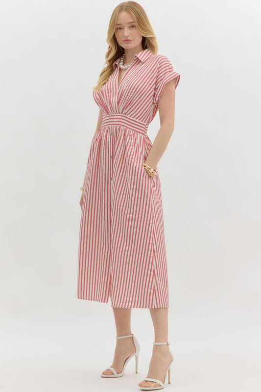 Stripe pattern surplice spread collar short sleeve pullover midi dress w/ faux button closure skirt, pockets, & smocked waist at back