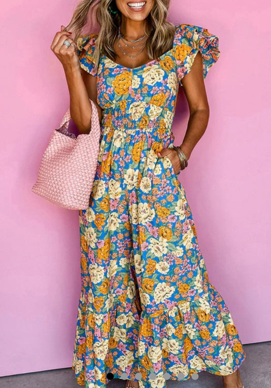 Yellow floral all over print shirred cut out high waist jumpsuit