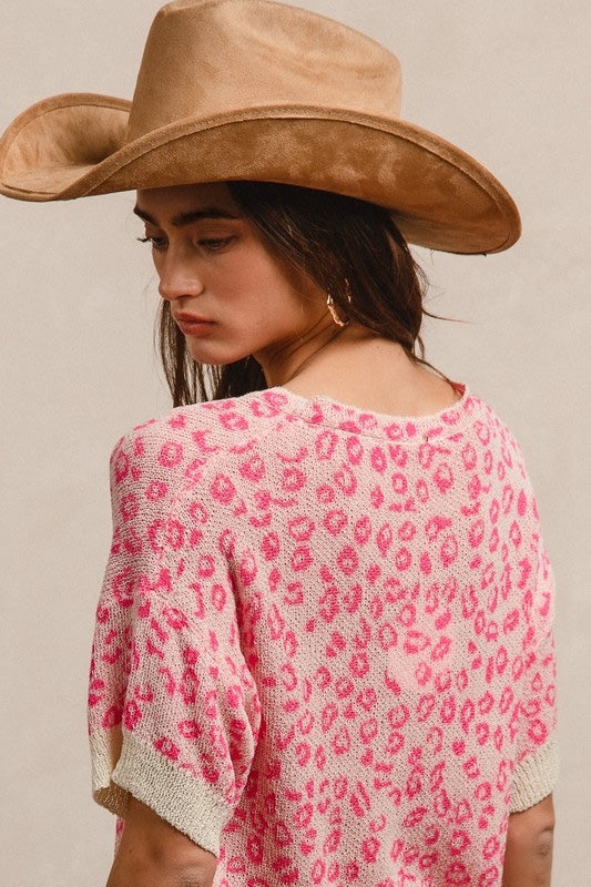 Leopard patterns with contrast edge detail v neck knit top