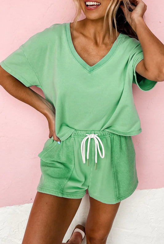 Mint green v-neck drop shoulder tee and patchwork drawstring shorts set