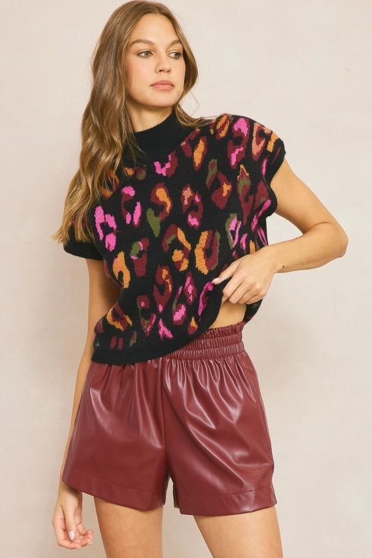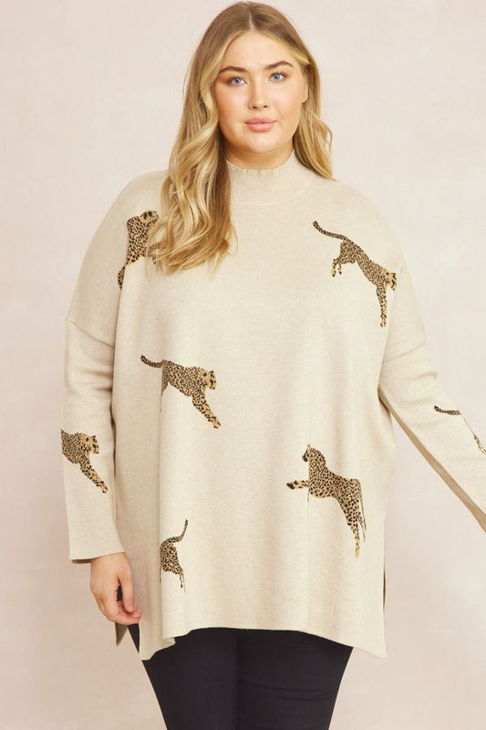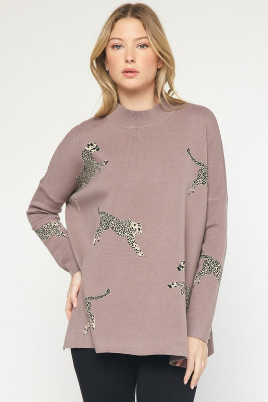 Cheetah Print Mock Neck Long Sleeve Sweater w/ Drop Shoulders